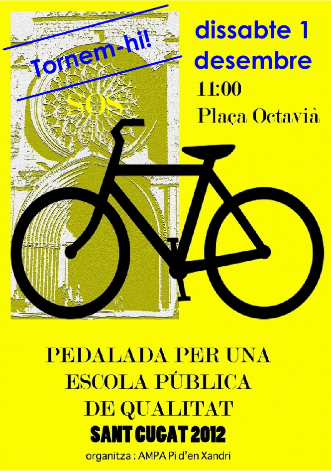 Tornem a organitzar la PEDALADA EN DEFENSA DE L’ESCOLA PÚBLICA, que la pluja ens va impedir celebrar el passat mes de setembre. T´ESPEREM A TU I LA TEVA FAMILIA EL PROPER DISSABTE, 1 DE DESEMBRE DE 2012 A LES 11 HORES A LA PÇA. OCTAVIÀ PER FER UNA PEDALADA EN DEFENSA DE L’ESCOLA PÚBLICA. JUNTS FAREM UN RECORREGUT PELS CARRERS DE SANT CUGAT I, EN ACABAR, LLEGIREM UN MANIFEST EN DEFENSA D´UNA EDUCACIÓ PÚBLICA DE QUALITAT.