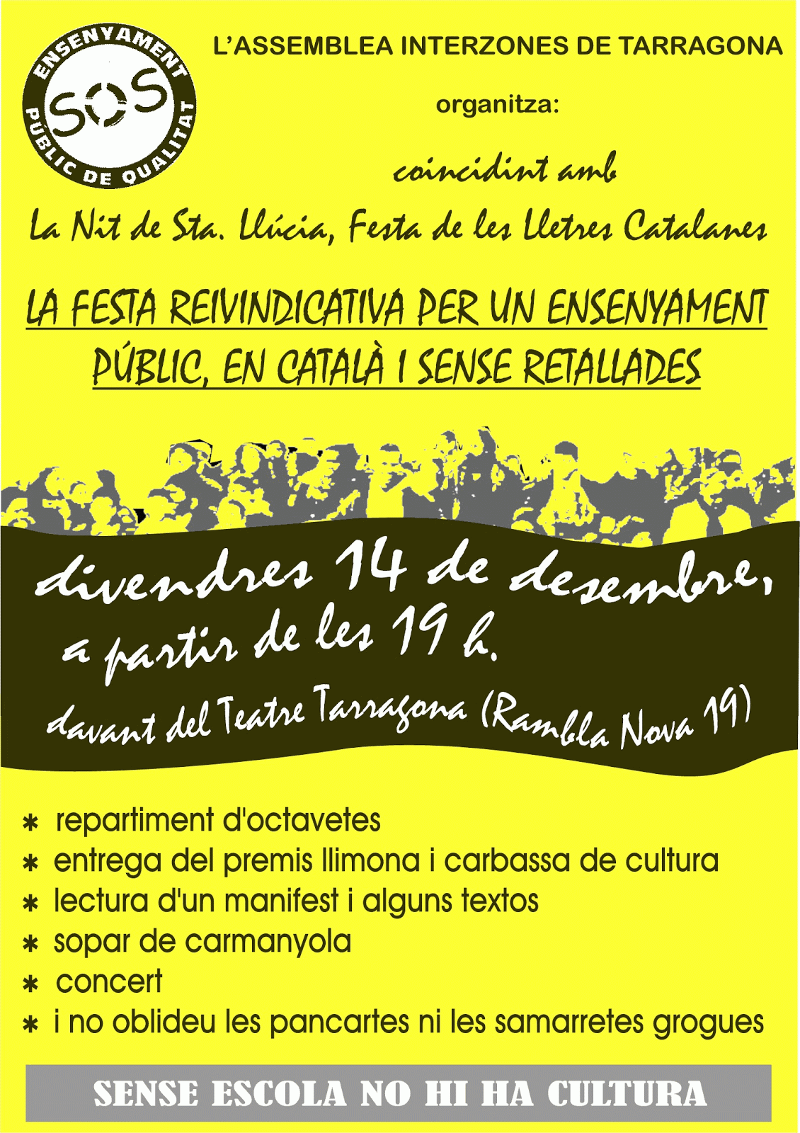 Tarragona, divendres 14, a partir de 19h: Festa reivindicativa per un ensenyament públic, en català i sense retallades Comparteix. Twitter Facebook Pinterest LinkedIn Tumblr Email