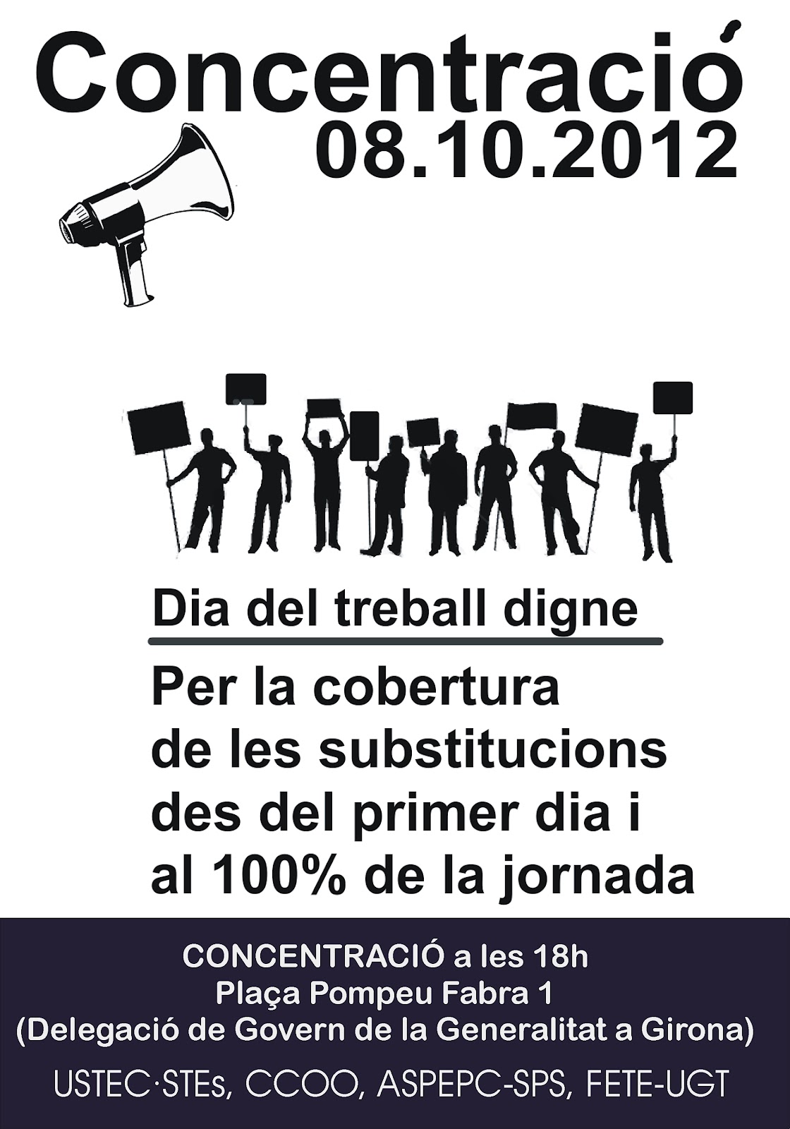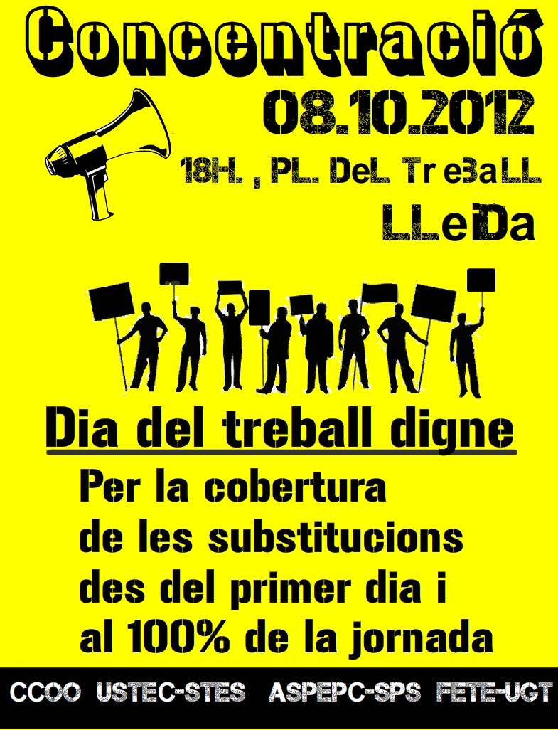 Els sindicats sotasignants convoquem a tota la comunitat educativa, el professorat i especialment els substituts i substitutes en el marc del DIA MUNIDAL DEL TREBALL DIGNE DOCENT, el dia 8 d’octubre a les 18h, a una CONCENTRACIÓ a la PLAÇA POMPEU FABRA 1 de GIRONA (Delegació del Govern de la Generalitat a Girona):