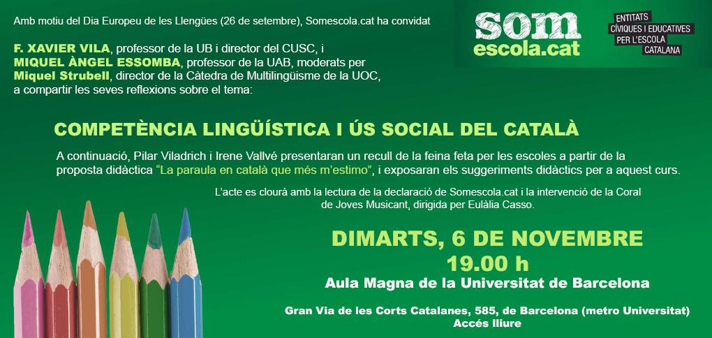 L’acte “Competència Lingüística i ús social del català” tindrà lloc el proper dimarts, dia 6 de novembre a partir de les 19.00 h a l’Aula Magna de la Universitat de Barcelona