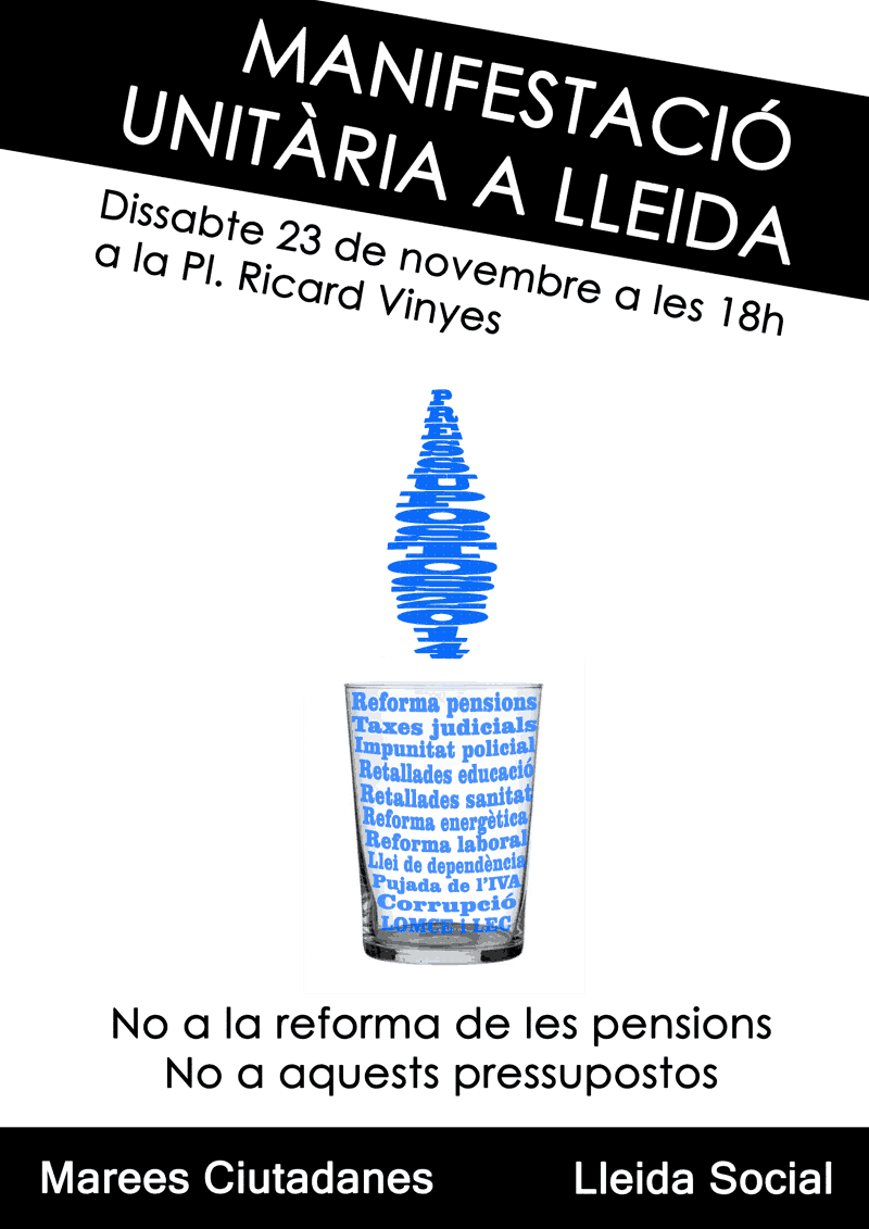 - una gran Manifestació Ciutadana el diumenge, 24 de novembre, al migdia, coincidint amb un cap de setmana en què el moviment obrer i les “marees” d’arreu de l’Estat celebraran també nombrosos actes de protesta…