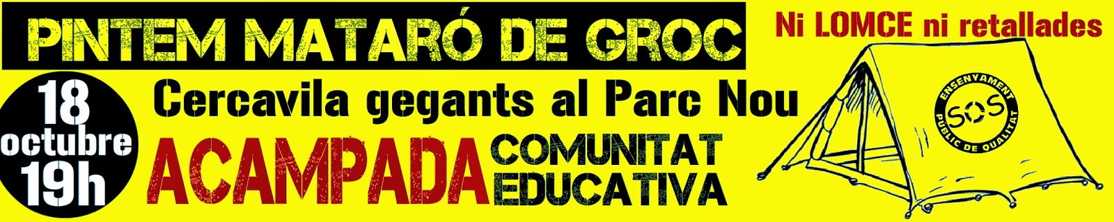 El proper divendres 18 d’octubre, Mataró i la resta del país acamparà a les seves places en contra de les retallades i la LOMCE. A Mataró, es farà una cercavila a les 19h des del Parc Nou fins l’ajuntament on s’acamparà i es farà nit allà.