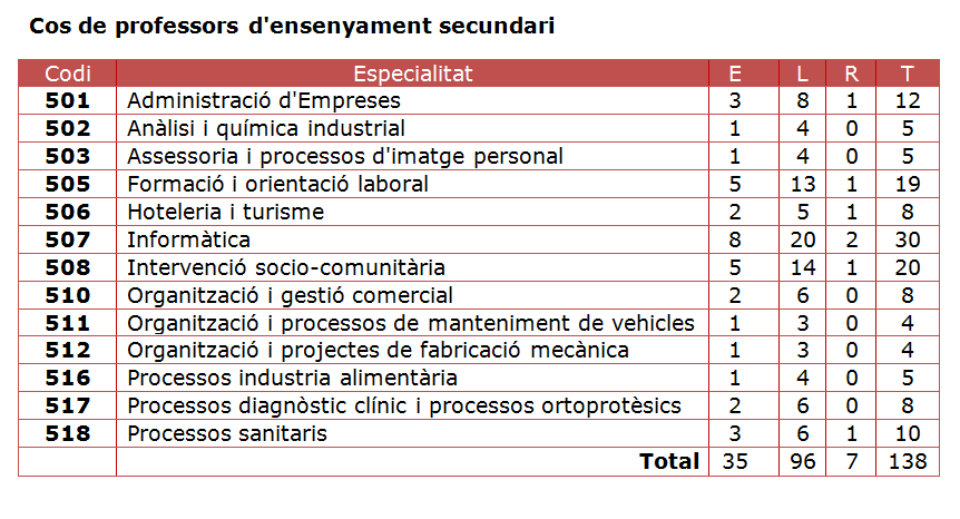 La previsió de distribució d’aquestes places per especialitats, i la determinació de les places de reserva, si escau, és la següent: