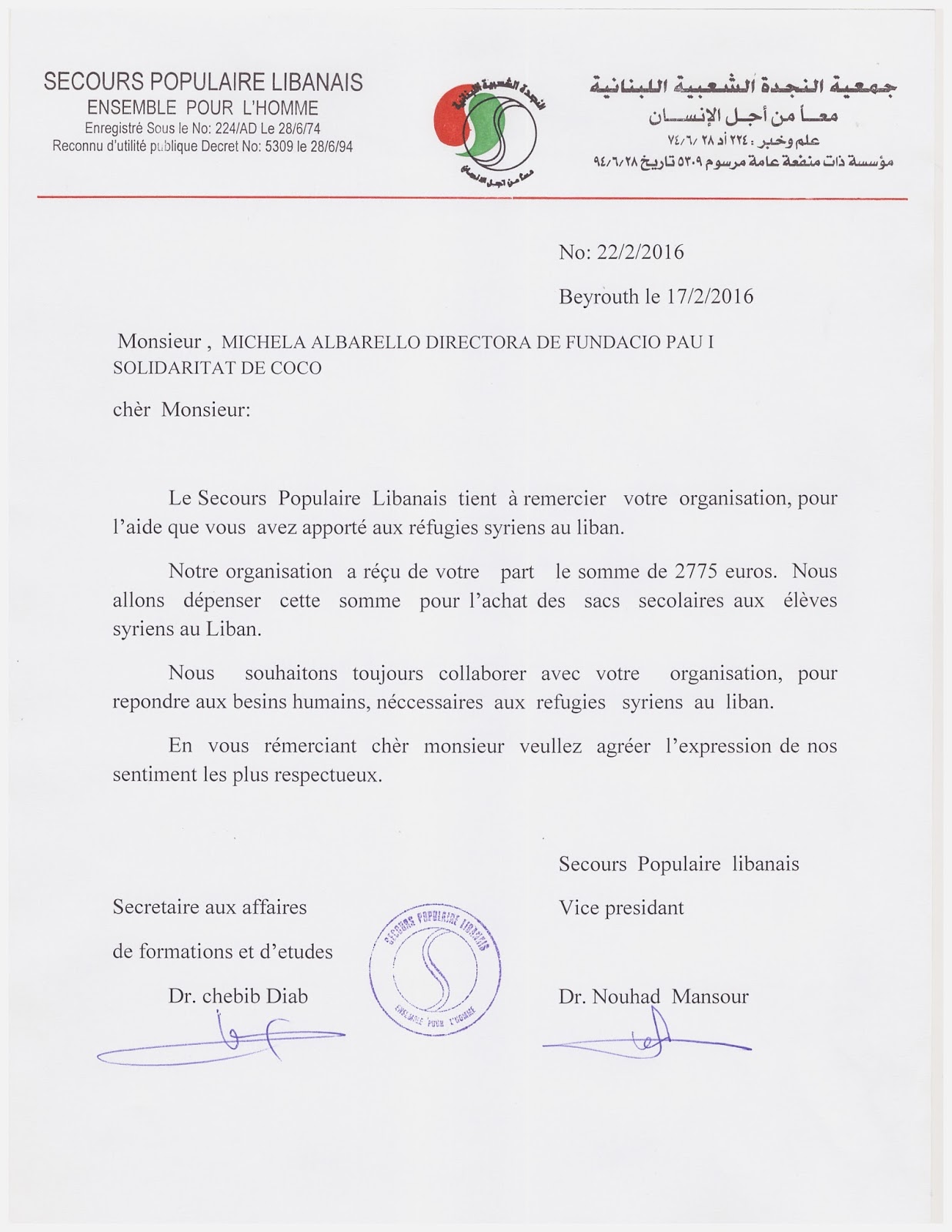 Carta del Socors Popular Libanés d’agraiment: