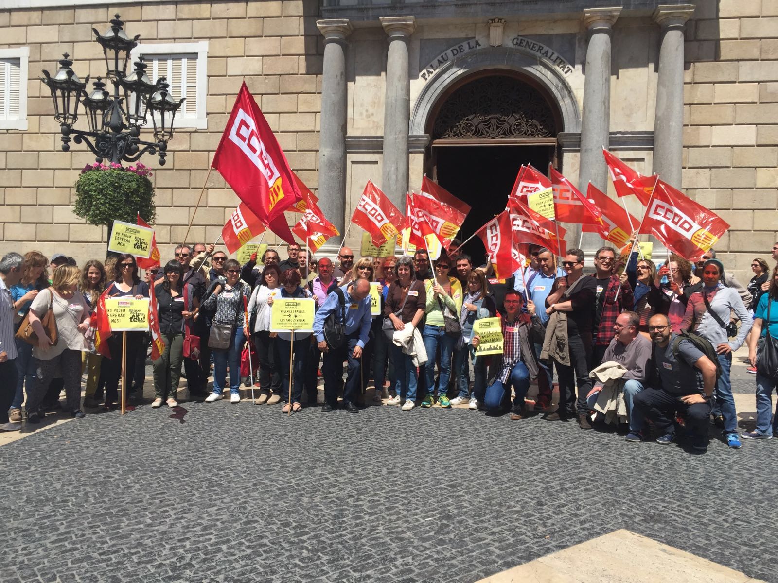 Els sindicats de la funció pública exigim al Govern de la Generalitat que no torni a quadrar el dèficit pressupostari amb les retribucions dels seus treballadors i treballadores. Ahir mateix delegats i delegades de CCOO, IAC i UGT ens vam concentrar a Barcelona davant la seu del Departament d’Empresa i Coneixement de la Generalitat (c/Sepúlveda, 148-150) i després vam marxar fins a la seu de la Generalitat a la plaça de Sant Jaume per mostrar al Consell Executiu el nostre rebuig a la seva actuació i exigir que l’avantprojecte de pressupostos reculli les nostres reivindicacions.