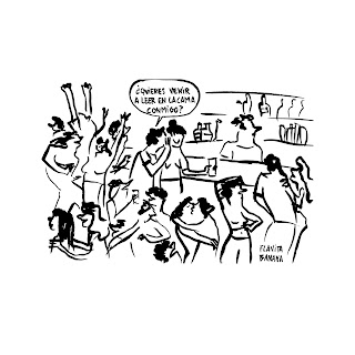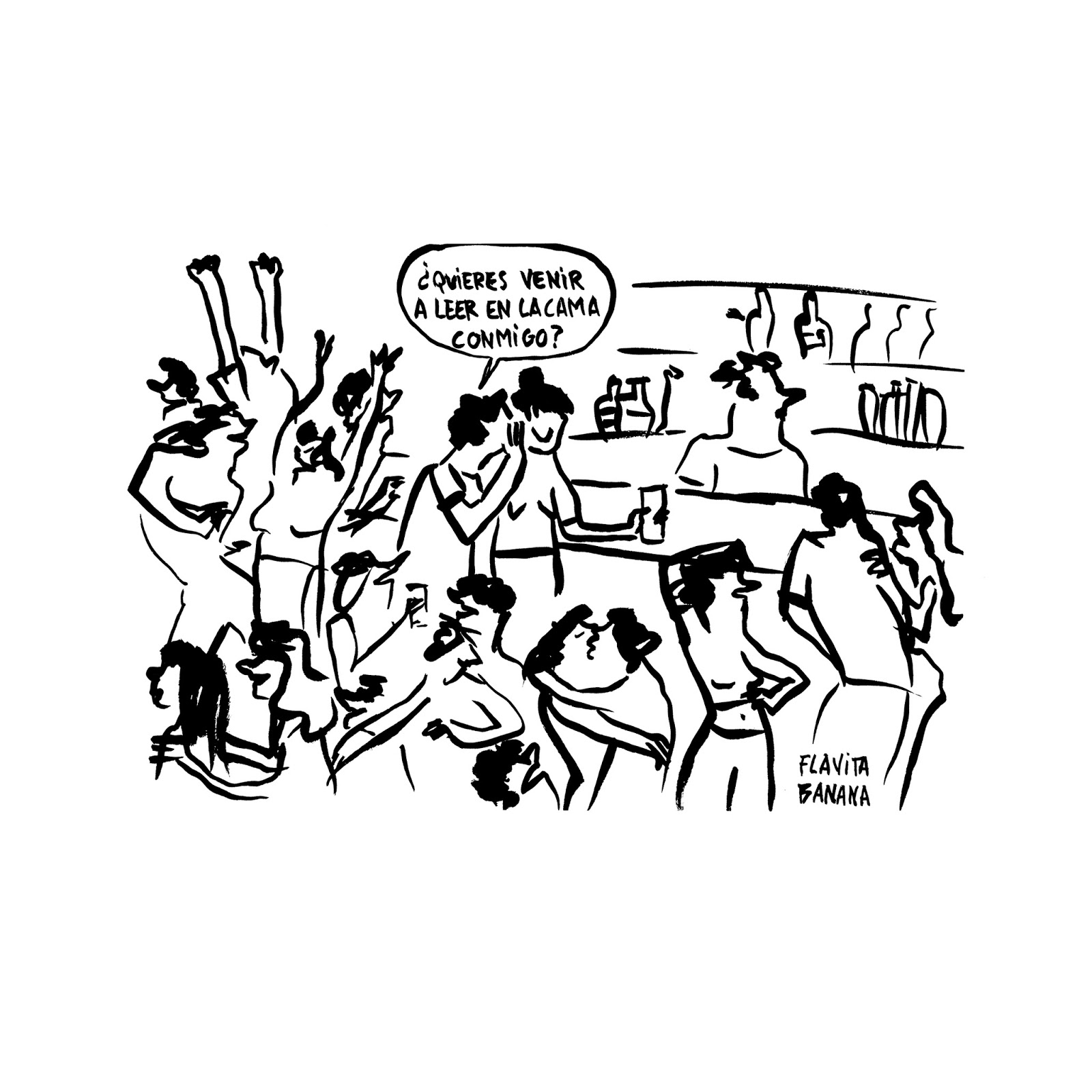 Cierto es que suelen ser mujeres las protagonistas de las viñetas de Flavita, pero no lo es menos que en muchas de ellas el resultado sería equiparable con un protagonismo masculino. Aunque estemos ante una voz femenina, que habla mayoritariamente a través de mujeres, una parte interesante de esa subjetividad es la reflexión sobre aquello que nos une. Porque una parte igual de importante para combatir la desigualdad como es el señalar el trato diferencial, también lo es esa reflexión sobre los elementos que nos hacen no tan distintos.