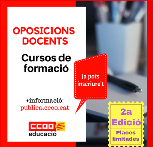 Aquest divendres iniciem la primera edició dels curosos d’orientació per la programació didàctica pel nou procés d’oposició que s’iniciarà aquesta primavera. En aquesta primera edició s’ha fet una oferta de 12 cursos, entre primària i secundària, en diverses localitats, amb una exitosa inscripció de centenars d’alumnes. Fruit de la gran demanda la Federació d’Educació de CCOO hem aconseguit organitzar una 2a edició dels cursos de preparació de les oposicions per al cos docent de primària i secundària.