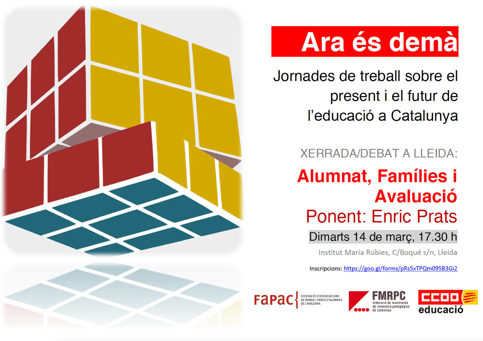 Aquesta segona jornada es realizarà a l’Institut Maria Rúbies de Lleida i ens acompanyarà el professor de pedagogia internacional, Enric Prats, que ens donarà el marc per a debatre al voltant de l’alumnat, les famílies i l’avaluació en la transformació de l’educació.