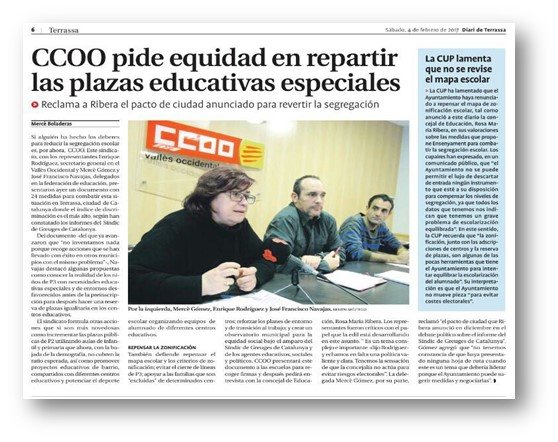 Davant aquesta problemàtica, des de CCOO Educació Vallès Occidental el setembre de 2016 vàrem engegar un grup de treball per presentar propostes concretes a la ciutat de Terrassa per revertir la situació. Vàrem redactar un document amb 24 propostes per poder implementar des de l’àmbit municipal, al curt, mig i llarg termini. I vàrem fer la presentació pública de les propostes en roda de premsa el dia 3 de febrer de 2017.
