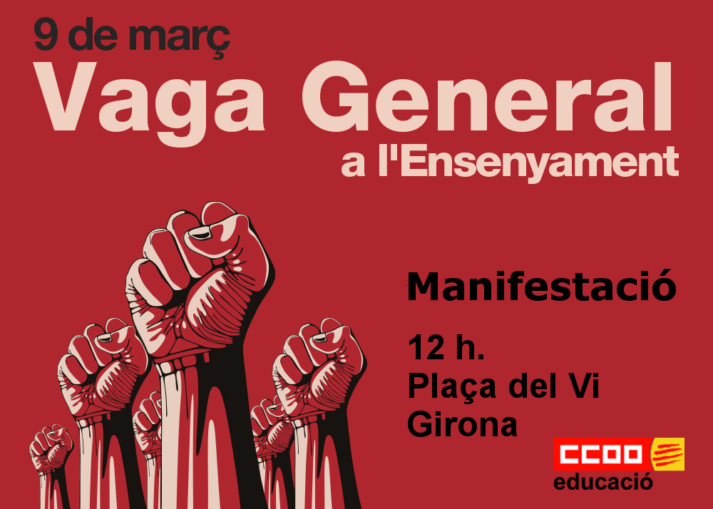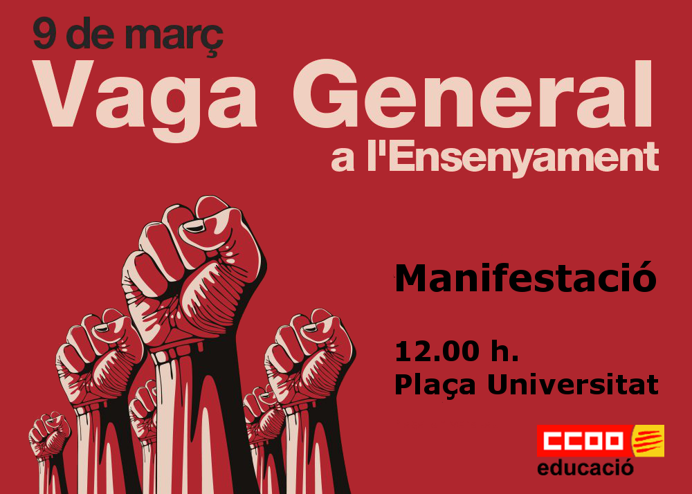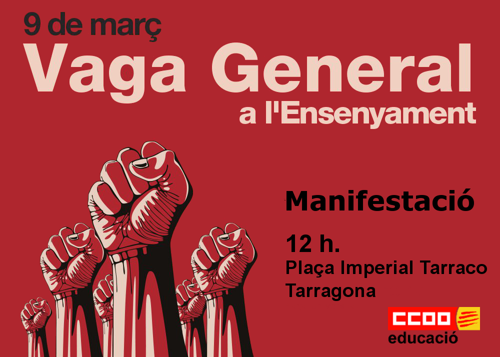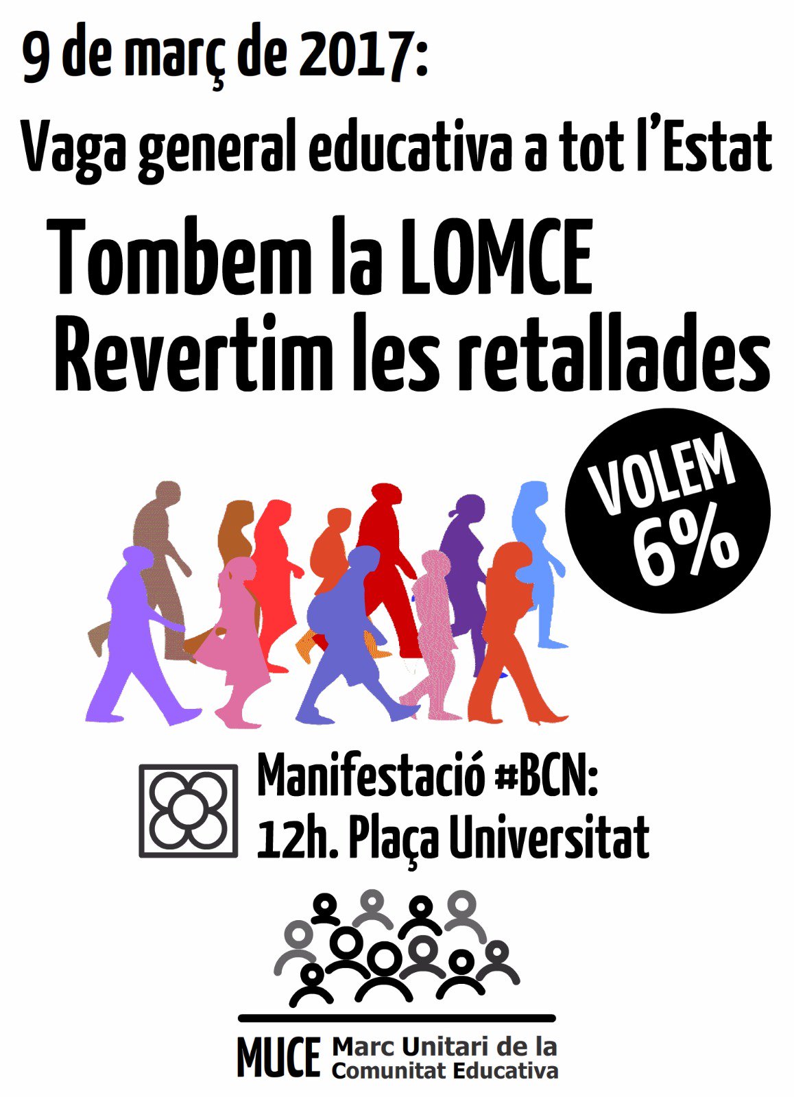 Amb motiu de la vaga del 9M es faran les concentracions/manifestacions següents: BARCELONA: Plaça Universitat, 12:00h GIRONA: Plaça del Vi, 12:00h TARRAGONA: Plaça Imperial Tarraco, 12:00h LLEIDA: Plaça de la Pau, 12:00h (concentració) MUCE Comparteix. Twitter Facebook Pinterest LinkedIn Tumblr Email