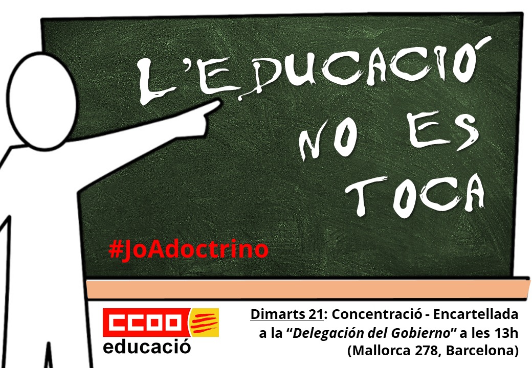 Per aquest cúmul de motius, la Federació d’Educació de CCOO de Catalunya convoca als delegats i delegades de l’educació catalana davant de la Delegació del Govern per encartellar els voltants amb la consigna #JoAdoctrino. Durant l’acte es llegirà un comunicat de denúncia.